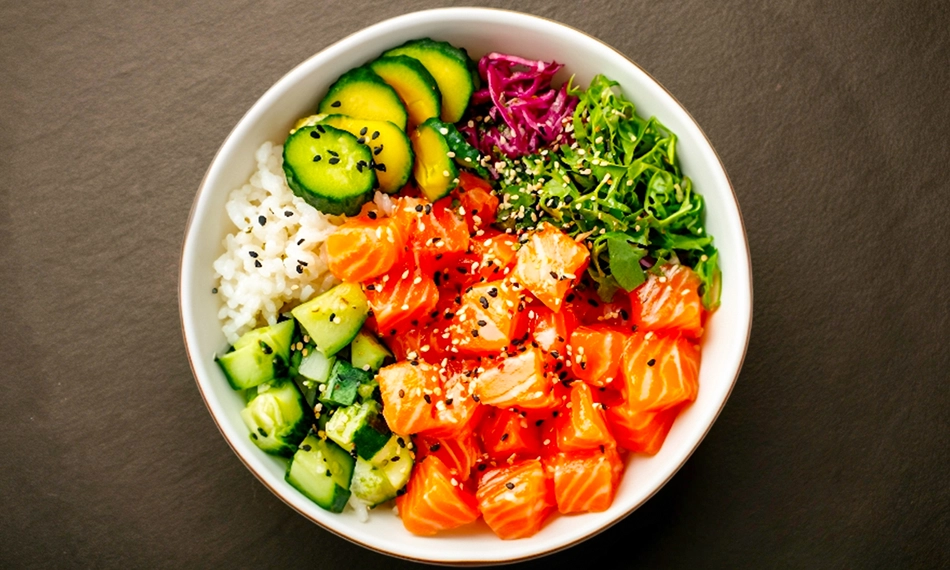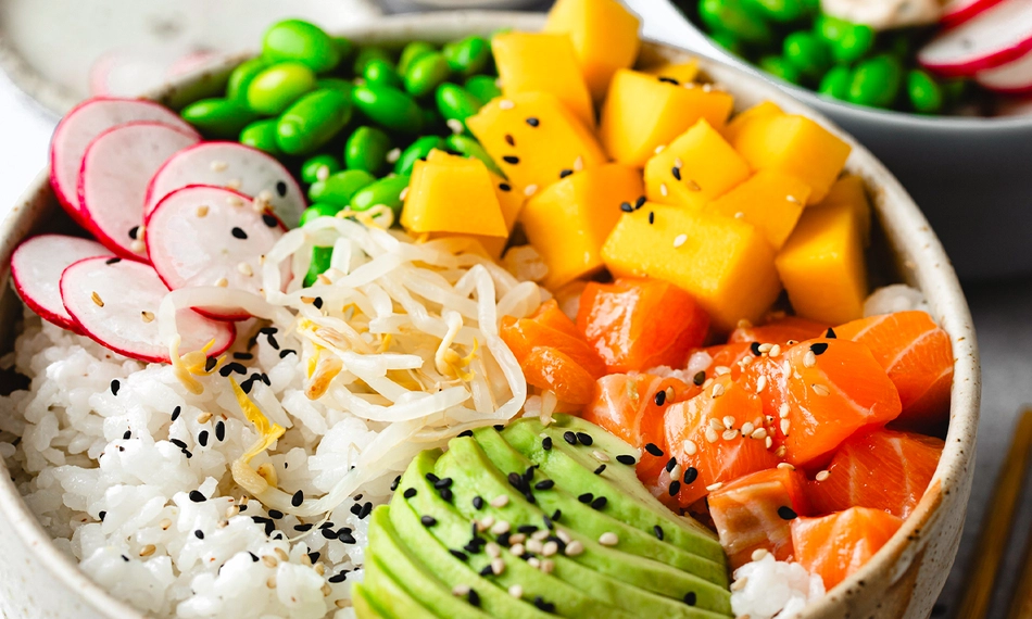 Alle pokébowls worden afgemaakt met gebakken ui, spicy mayonaise, teriyaki groen ui-bladeren, sesamzaadjes, sweet chili Japanse gember en notenmix