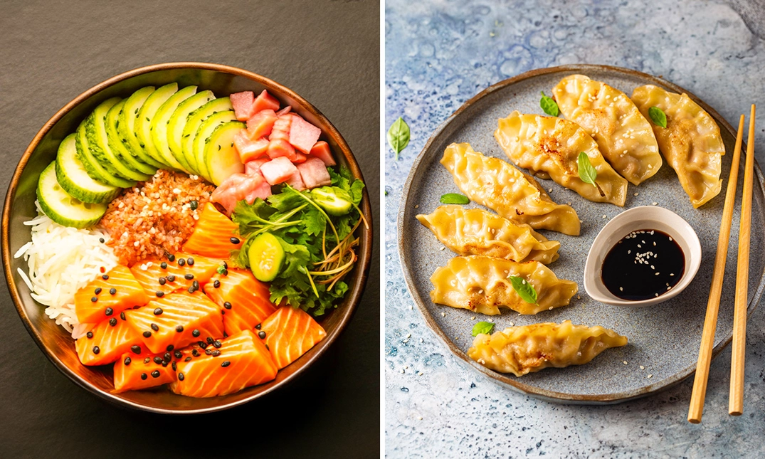 2-gangen pokébowldiner voor dine-in of afhaal bij Agrea in Gent: ga bijvoorbeeld voor gyozas vooraf met een pokébowl met tempuragarnalen