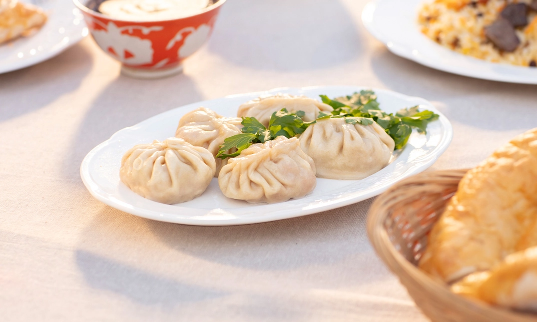 gestoomde deegbuideltjes gevuld met rundvlees en flespompoen, op smaak gebracht met komijn en knoflook, geserveerd met chilisaus - Toho kordak (voor 2 personen)