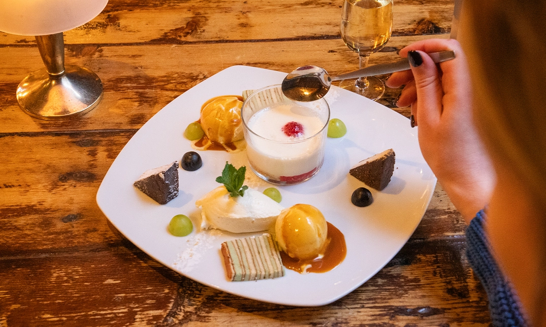 je krijgt een proeverij met 4 wisselende desserts om te delen