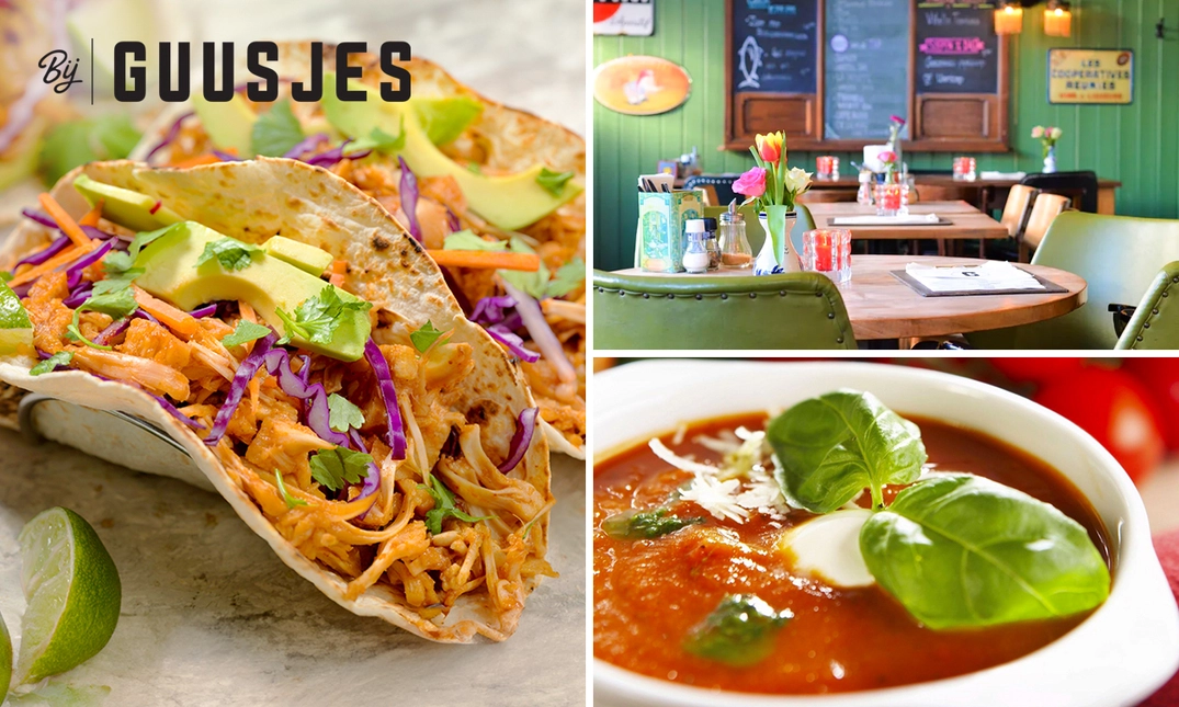 Geniet van een heerlijke 2- of 3-gangen keuzelunch in het gezellige buurtcafé en restaurant Bij Guusjes: ga bijvoorbeeld voor een kop huisgemaakte soep, de Korean bagel en een smeuïge brownie