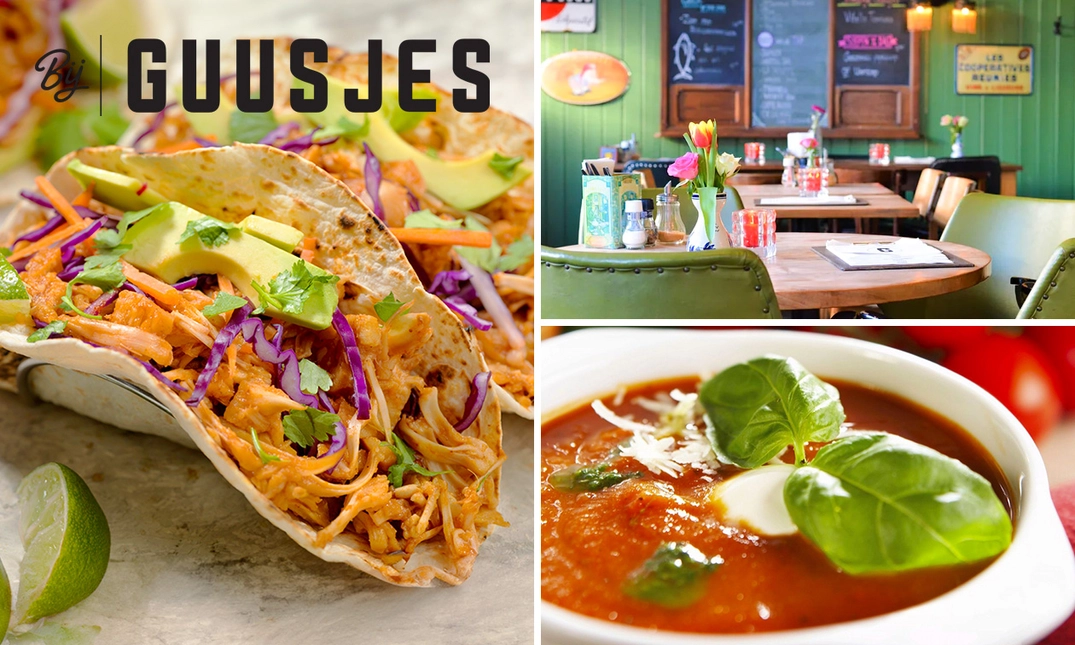 Geniet van een heerlijke 2- of 3-gangen keuzelunch in het gezellige buurtcafé en restaurant Bij Guusjes: ga bijvoorbeeld voor een kop huisgemaakte soep, de Korean bagel en een smeuïge brownie