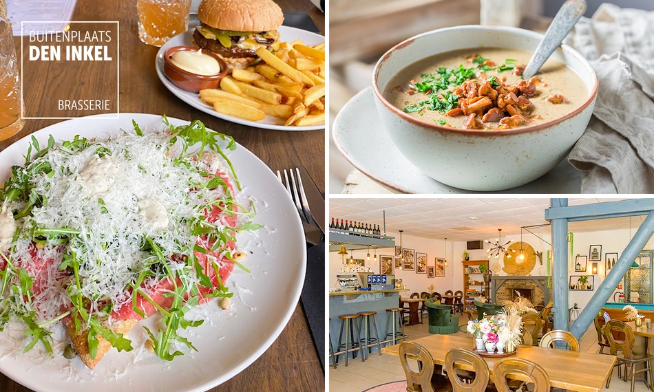 Voel je welkom bij Brasserie Den Inkel. Bij deze sfeervolle brasserie geniet je van een heerlijke 2-gangen keuzelunch. Vooraf smul je van de huisgemaakte soep van de dag. Ga bij het hoofdgerecht bijvoorbeeld voor geitenkaassalade, kroketten op brood of een broodje carpaccio. Wat je ook kiest, jouw smaakpapillen worden gegarandeerd verwend. En met het prachtige uitzicht op natuurgebied Den Inkel is jouw middag helemaal compleet. Geniet ervan!