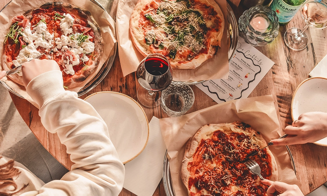 met parmaham, burrata, tomatensaus, fior di latte mozzarella en rucola