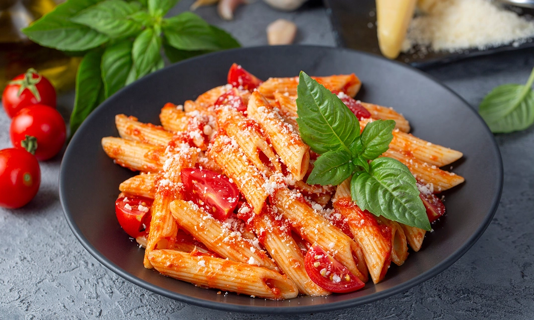 fijne capellini met gebakken scampi, zongedroogde tomaten en een romige saus met een zacht pittige toets, elegant en vol van smaak