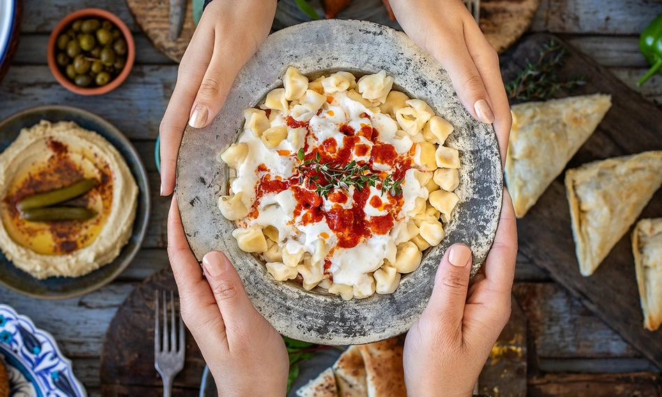 gegrilde runderköfte met frietjes en frisse salade - Turkse ravioli met rundergehakt "mantı"