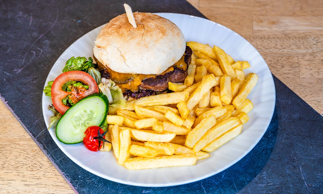 Mühlen Burger mit saftigem BBQ Rinderhack und Pommes - Schlot met Kies vum Hennes sing Frau