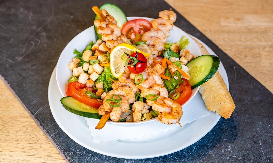 Bunter Salat mit gebratenen Hähnchenstreifen - Schweinebrode met huuseige Zauß