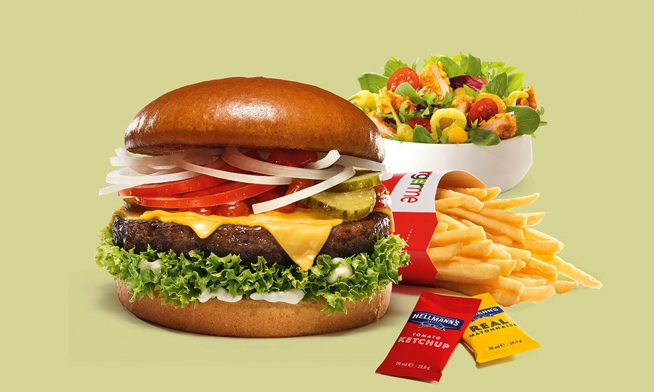 Geniet van een verrukkelijke burger naar keuze inclusief friet met mayonaise en eventueel een snack of salade bij burgerme Wijchen: geniet van deze heerlijke snelle maaltijd