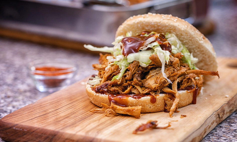aus gezupftem Schweinefleisch mit Joppiesauce, Coleslaw Salat und BBQ-Sauce - Orient (v)