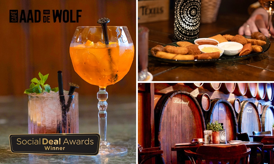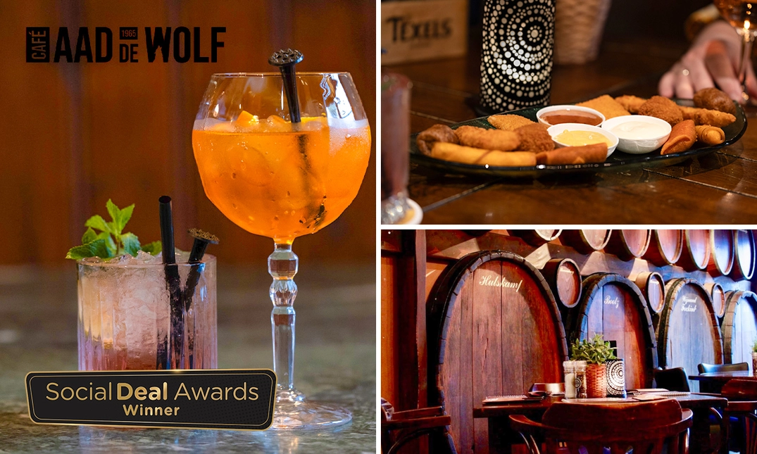 Zin in een gezellige avond vol met cocktails en heerlijke hapjes? Kom dan langs bij Café Aad de Wolf. Bij dit sfeervolle café geniet je van 2 verfrissende cocktails naar keuze en bittergarnituur of el rancho (kipstukjes met friet). Verwen jouw smaakpapillen bijvoorbeeld met een aperol spritz en een mojito. Kom langs met vrienden en geniet samen van een onvergetelijke tijd. Enjoy!