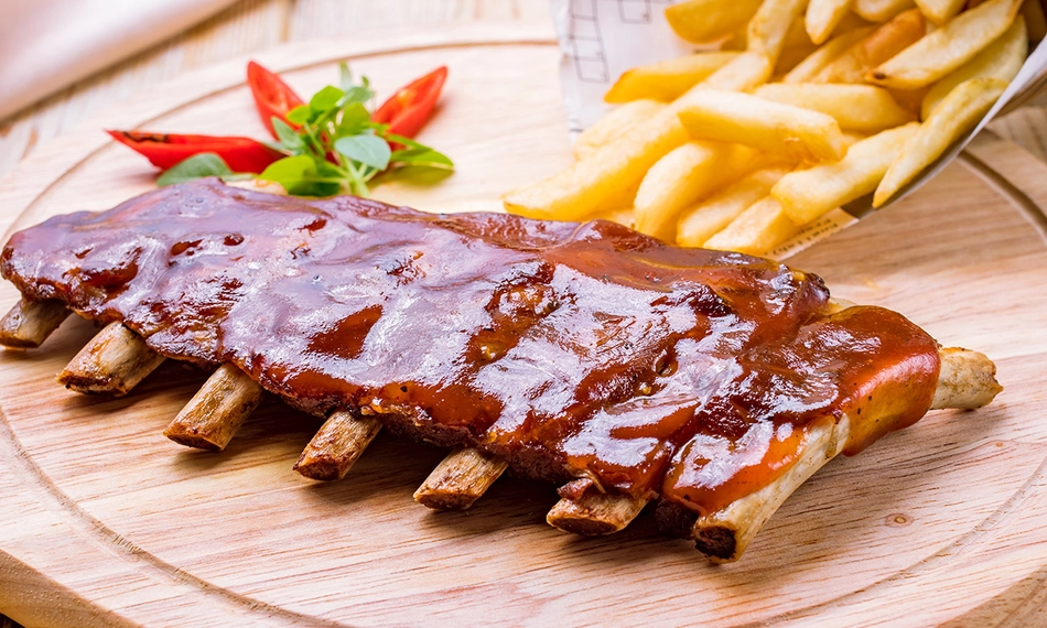 De hoofdgerechten (met uitzondering van de salades) worden geserveerd met friet, koolsla en mayonaise