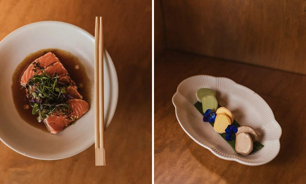 licht gebrand rundsvlees, sichuanpeper, wakame zeewier, gefrituurde ui, look en sriracha