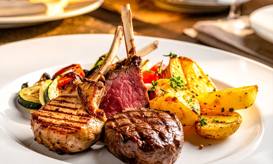 Geniet van een luxe mixed grill met saus en een aardappelgerecht naar keuze bij De Boskar Pelt: met kip, varkenshaas, steak en lamsvlees