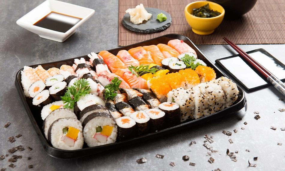 Sushibox (32 of 56 stuks) om af te halen of thuis te laten bezorgen van Delicious and Healthy in Aalten: keuze uit mix, vegan en party