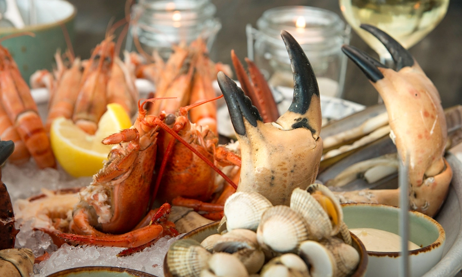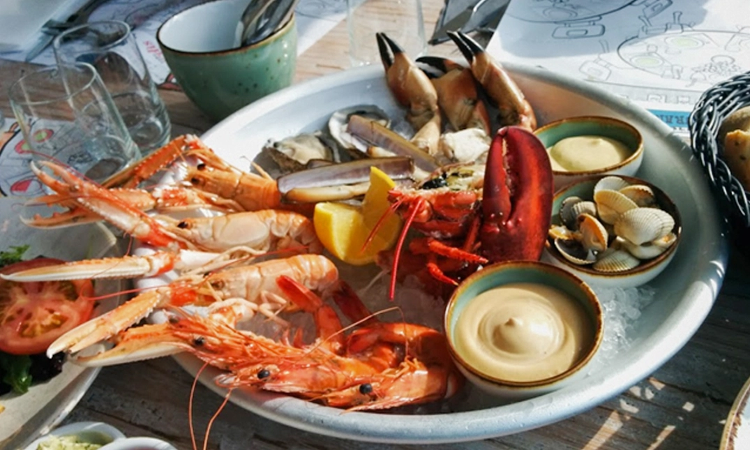 gamba’s, oesters, kokkels, Noordzeekrab, scheermessen, langoustine, hele kreeft, sliptong, schol, citroen-basilicummayonaise en cocktailsaus (per 2 personen te bestellen)