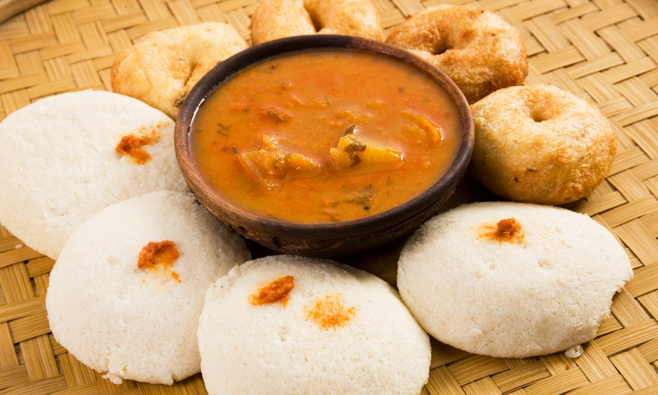 weiche, dampfgekochte Reiskuchen, serviert mit Linsensuppe, die gemischtes Gemüse und eine Mischung von Gewürzen aus der Speisekammer enthält - Pani Puri