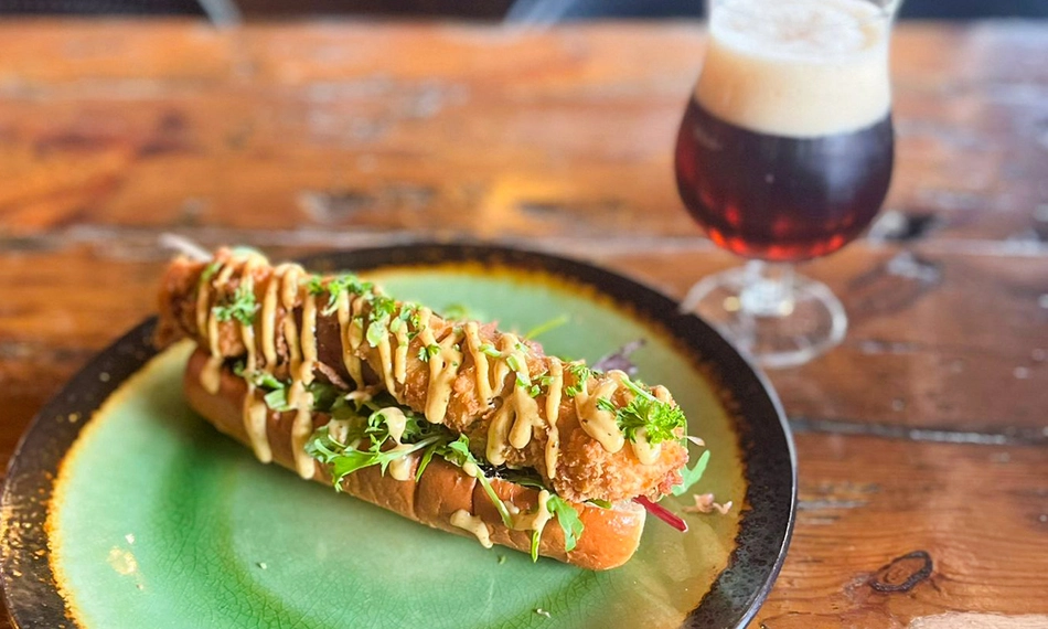 met homemade light spicy edamame burger, flamed mayo op een black bun, rijst en geroosterde puntpaprika - Wienerschnitzel champignonsaus (+ €3)