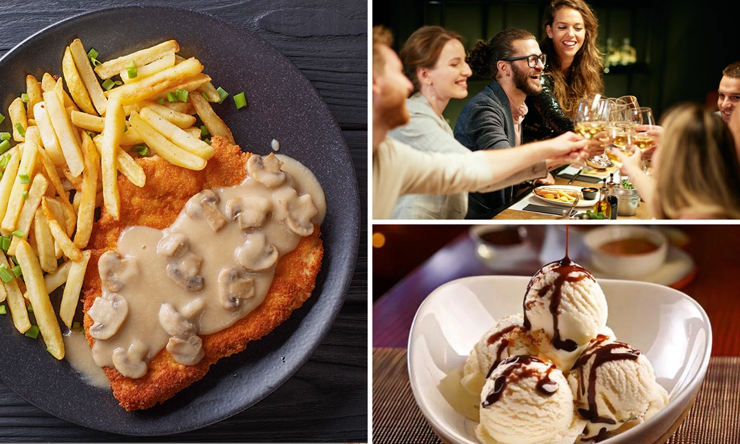 • Geniet bijvoorbeeld van tomatensoep, varkensschnitzel en een Oreo-parfait