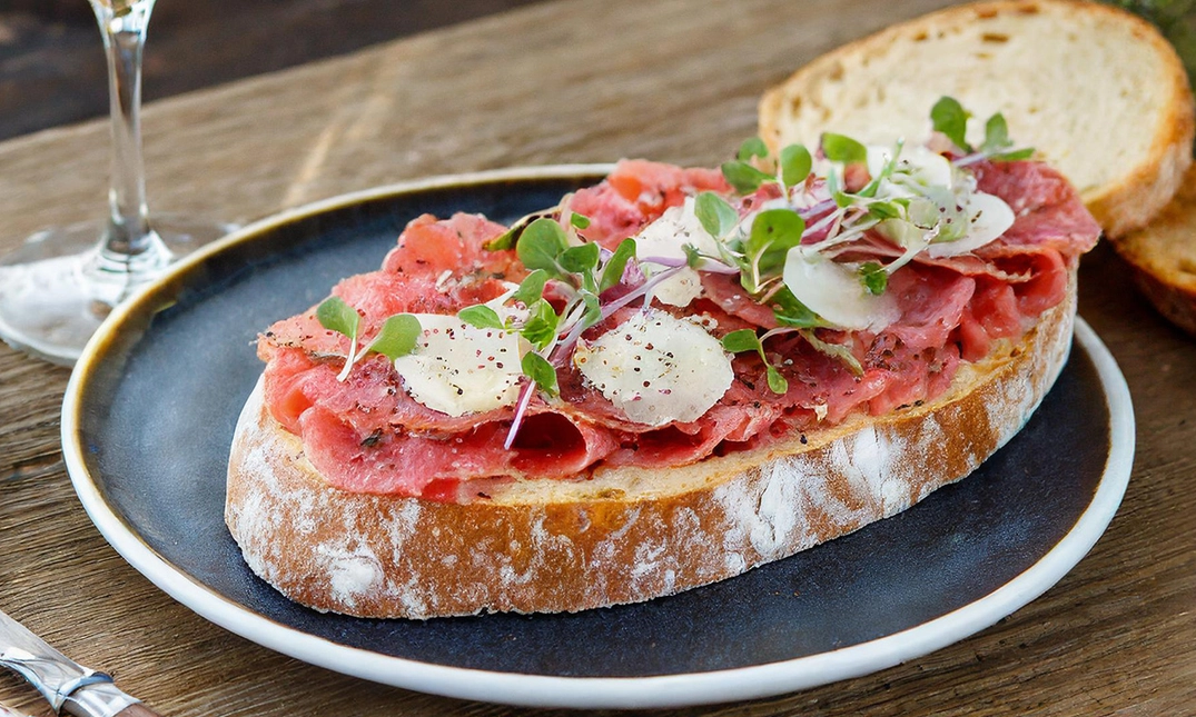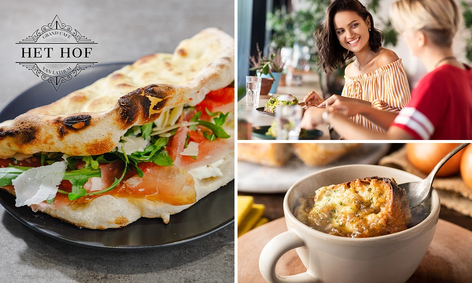 Geniet van een heerlijke 2-gangen keuzelunch bij Het Hof van Lathum: smul bijvoorbeeld van Franse uiensoep en een lekkere flatbread parma