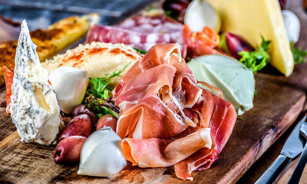 Geniet van een heerlijke tapasplank voor 2 tot 4 personen om af te halen bij Hoevewinkel 't Omloophof: met diverse kazen, charcuterie, crackers met dipsaus en meer