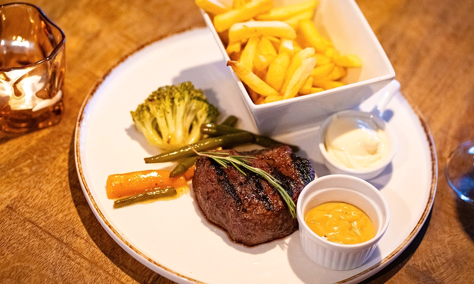 Geniet van een heerlijke 2-gangenlunch à la carte bij IJmuiden Steakhouse: met bij het hoofdgerecht bijvoorbeeld een broodje carpaccio of gerookte zalm