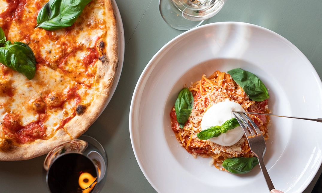 tomatensaus, mozzarella, zongedroogde tomaten, gebakken buffelmozzarella, groene pesto en basilicum - Pizza verde