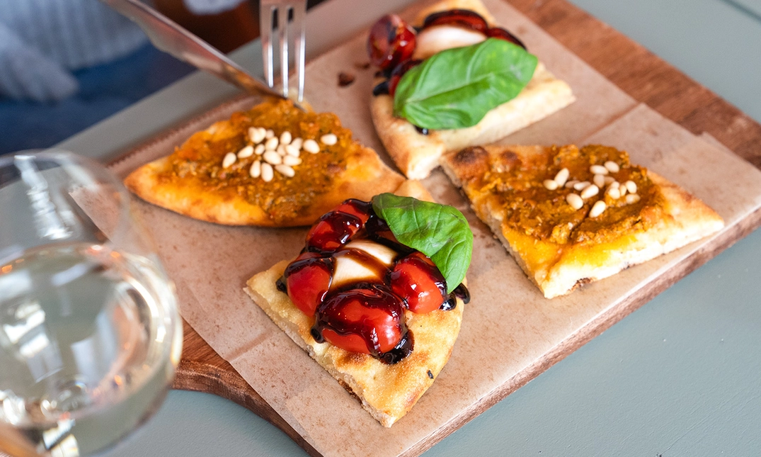 versgebakken focaccia met geroosterde cherrytomaten, burrata, rode pesto en pijnboompitten - ’Nduja e ricotta al forno