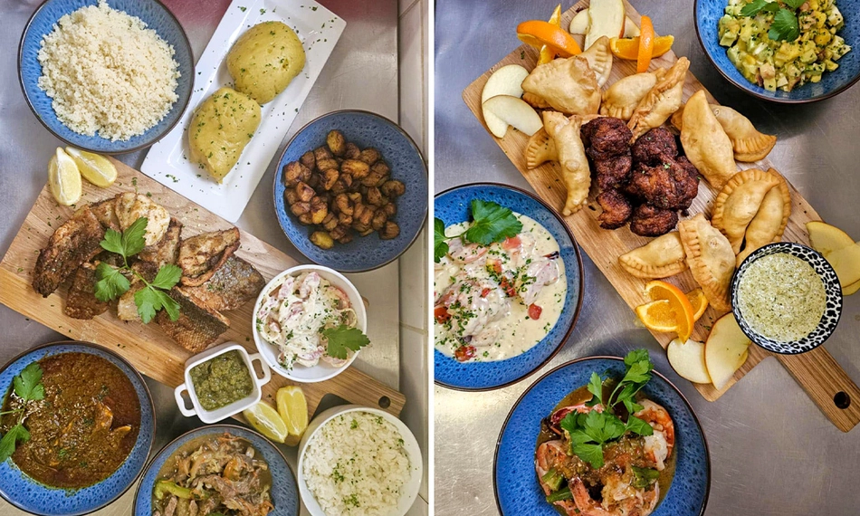 beignets de banane, pastel de viande, salade tropicale, tapenade africaine