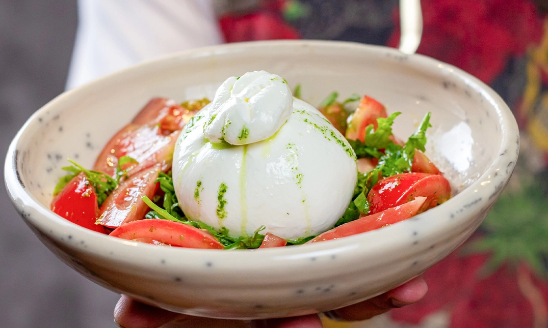 roquette, tomates cerises, basilic, huile d'olive vierge et pain - Burrata à la truffe