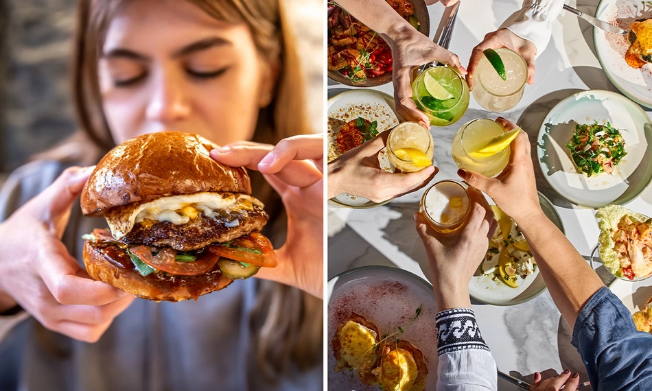 met Black Angus burger, bacon, tomaat, augurk, BBQ-saus, cheddar, salade en friet of gebakken aardappelen met mayonaise - Crispy chicken burger (+ €4)