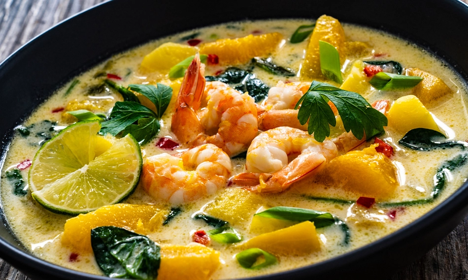 typisch gerecht uit Madras met ananas, limoen, kokosmelk, koriander en madrascurry (medium pikant)