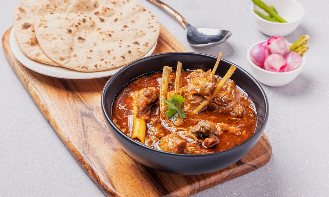 vlees gebakken in een tandoori-oven en geserveerd in yoghurtsaus met cashewnoten, room en methibaadjes