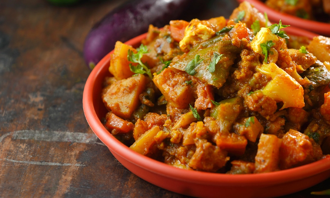 in de tandoori-oven gegrilde aubergines bereid in een curry van uien en tomaten