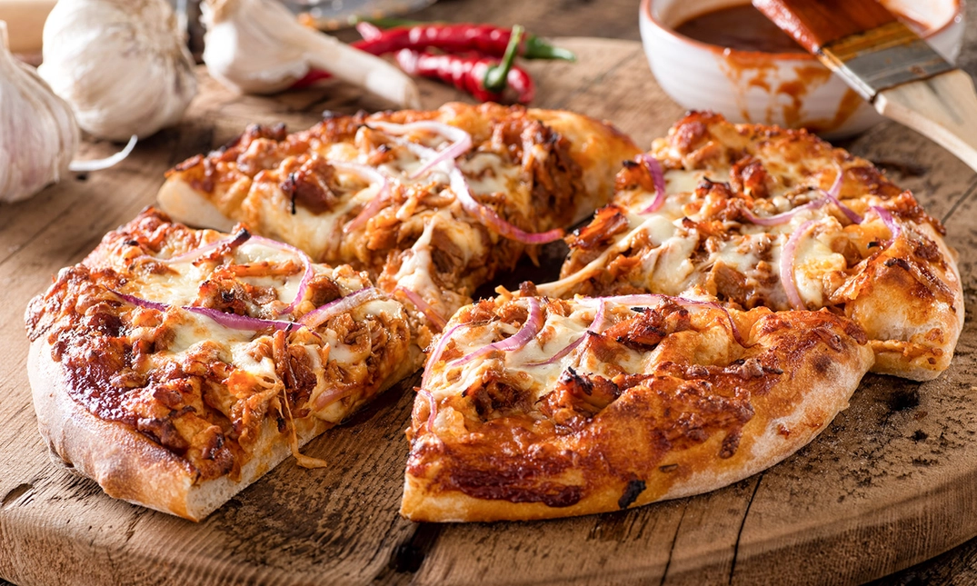 BBQ kip, mozzarella, paprika, ui, BBQ-saus, champignon, olijven