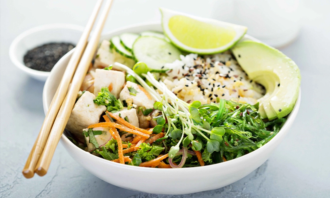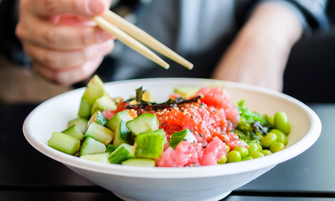 • Ga bijvoorbeeld voor een pokébowl met zalm, krokante kip of tofu