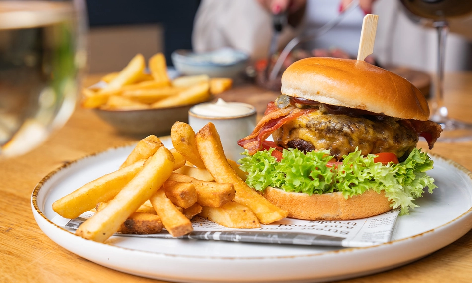 met briochebol, cheddar, sla, augurkenrelish, gekarameliseerde ui, frites, smokey BBQ-saus of truffelmayonaise