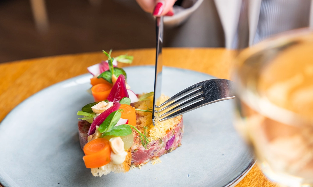 aangemaakt met dragonmayonaise, tramezzino, rode ui, hazelnoot, gepekelde eidooier, kappertjes en huis ingelegde tafelzuren (ook mogelijk als XXL: + €5)