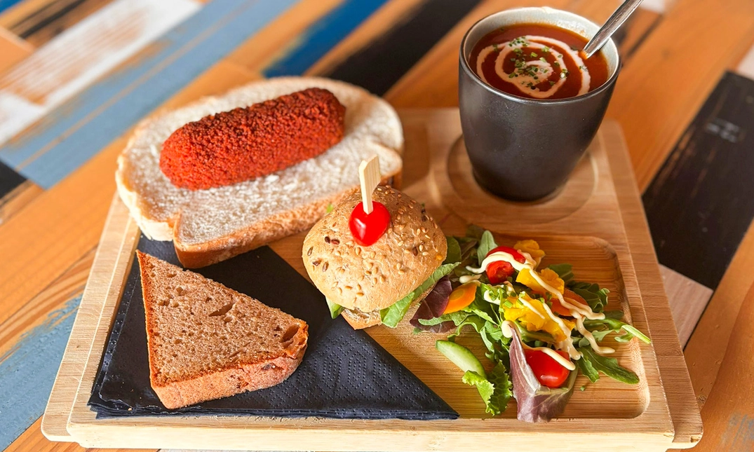 • Je krijgt een plank met soep, een mini-broodje truffel-eiersalade, brood met goulashkroket én een heerlijk stuk huisgemaakte appel-kaneelcake