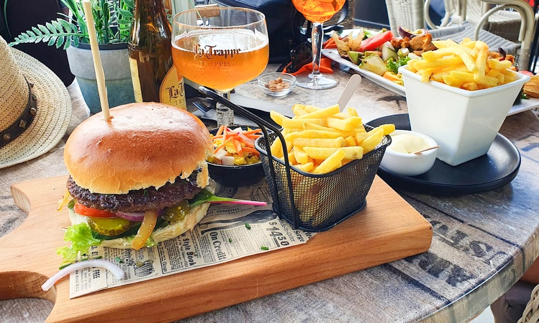 Alle hoofdgerechten worden geserveerd met frites en eventueel met een huisgemaakte frisse salade (+ €2,50). De burgers worden gemaakt met een brioche bun, sla, tomaat, augurk en rode ui, en geserveerd met salade en frites.