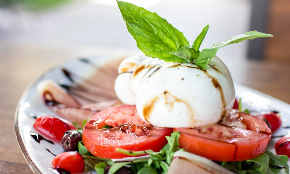 burrata met cherrytomaatjes, olijfolie, basilicum en kruiden
