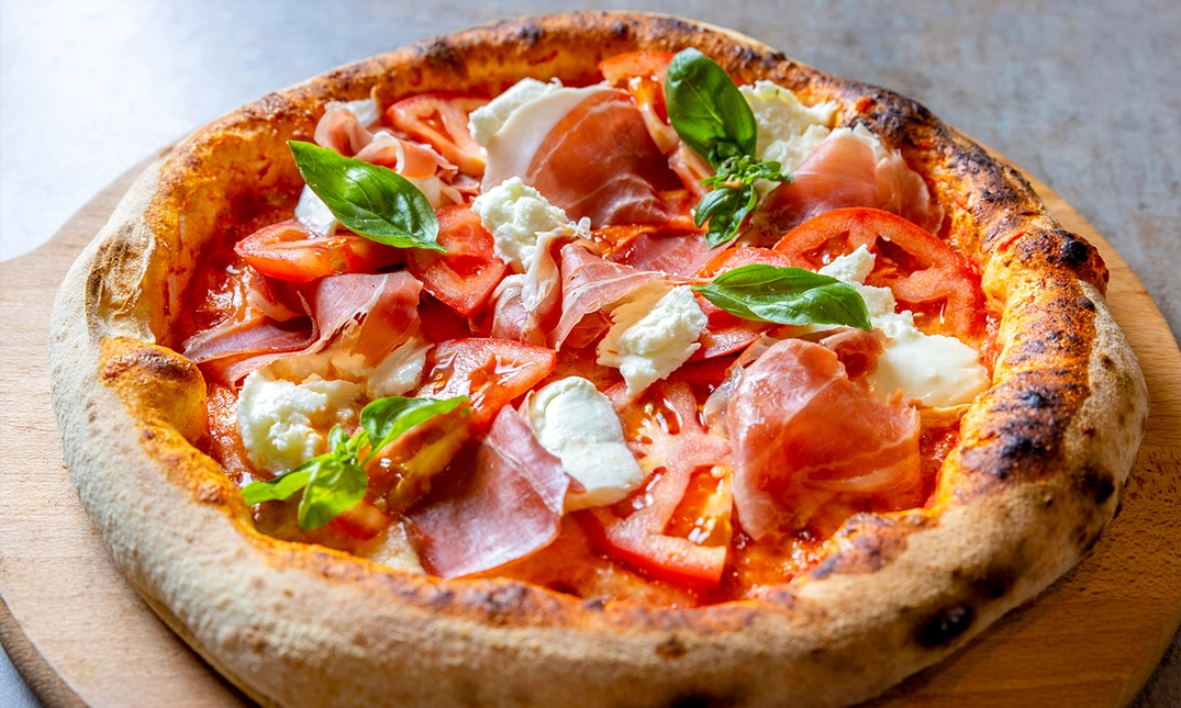 met tomatensaus, parmaham, cherrytomaatjes, rucola, basilicum en burrata