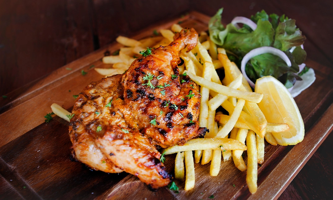 Met uitzondering van de pasta's worden de gerechten geserveerd met friet en salade.
