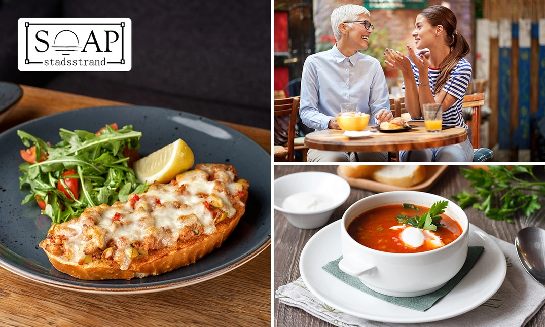 Kom genieten bij restaurant en bar SOAP, prachtig gelegen op het Apeldoornse stadsstrand. Kom gezellig langs met je vrienden of familie voor een lunch bestaande uit twee heerlijke gerechten. Geniet van een heerlijke soep en kies uit een belegd broodje of tosti. Of geniet van een heerlijk genietplateau voor 2 personen met diverse hapjes. Come hungry, leave happy!