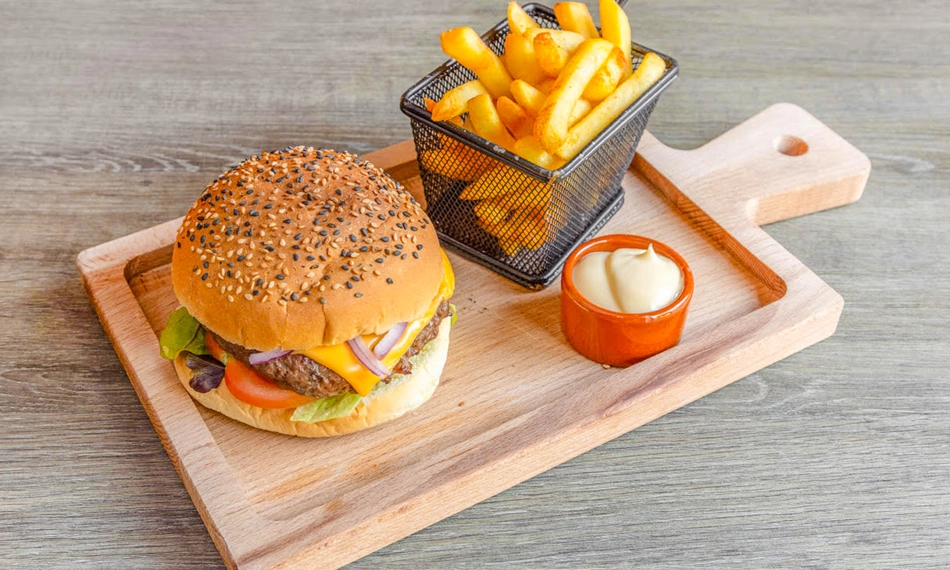 met Black Angusburger, cheddar, sla, tomaat, ui en huisgemaakte saus - Chicken burger