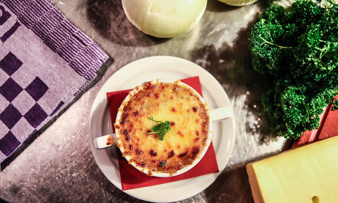 • Of wat dacht je van uiensoep, gevolgd door spareribs en crème brûlée als afsluiter?