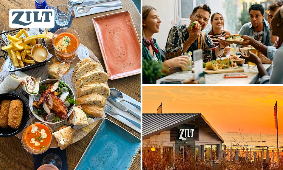 Verrukkelijke shared lunch bij Strandpaviljoen Zilt in Katwijk aan Zee: geniet samen met je favoriete gezelschap van een wrap carpaccio, broodje zalm, caesarsalade en meer