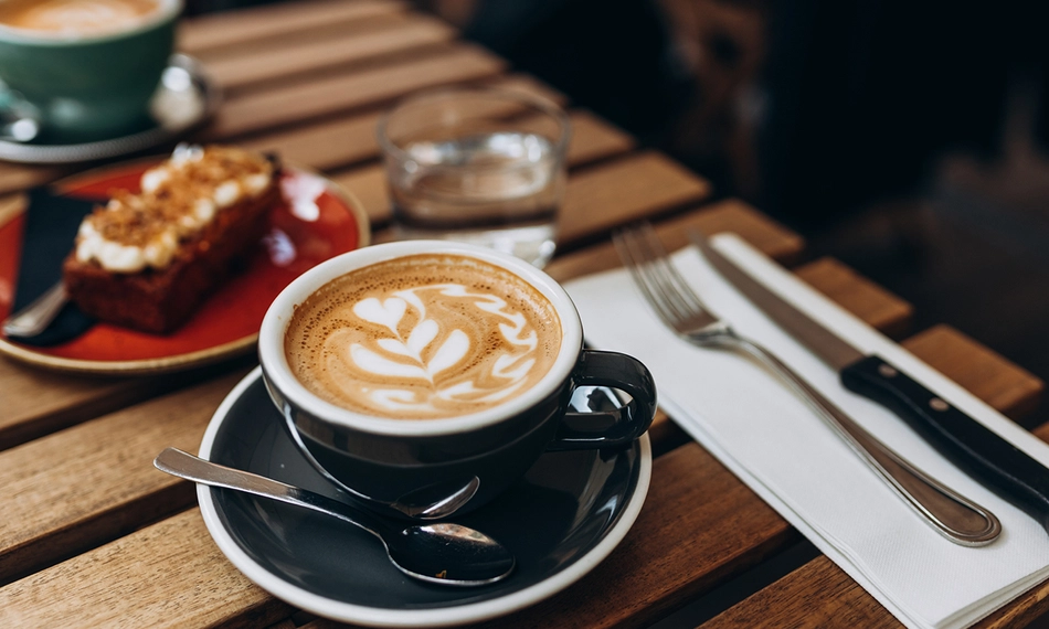 koffie, cappuccino of thee met stukje appelkruimeltaart of kersenvlaai, met slagroom (+ €0,60)