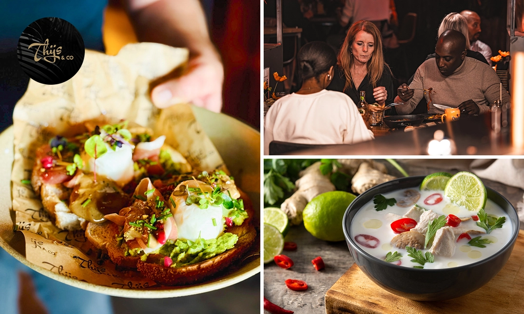 Geniet van een uitgebreide 2-gangenlunch bij Thijs & Co: proef bijvoorbeeld tom kha kai en een ciabata serranoham of een toast steaktartaar