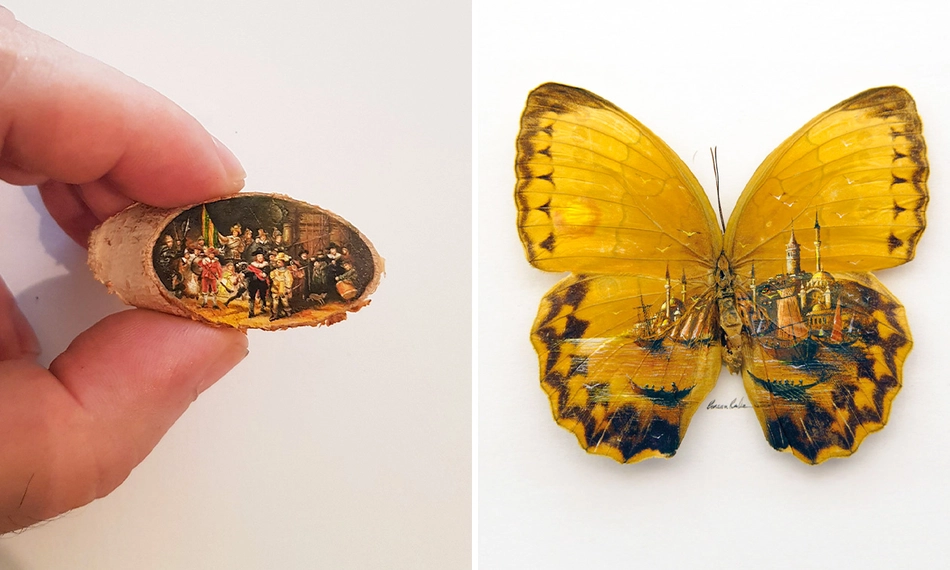 Bekijk bijvoorbeeld het Vrijheidsbeeld op een pompoenpit, of schilderingen op de vleugels van een vlinder, een vrouw met een waterkruik op een uienschil. Je zult met open mond staan kijken.
